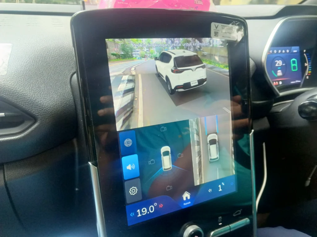 Fitur yang menurut saya keren banget, itu kamera 360 sih. Jadi di berbagai sudut mobil ini, itu udah terpasang kamera. Dan integrasi kumpulan kamera ini memungkinkan kita untuk memantau sekeliling mobil dari berbagai sudut view.