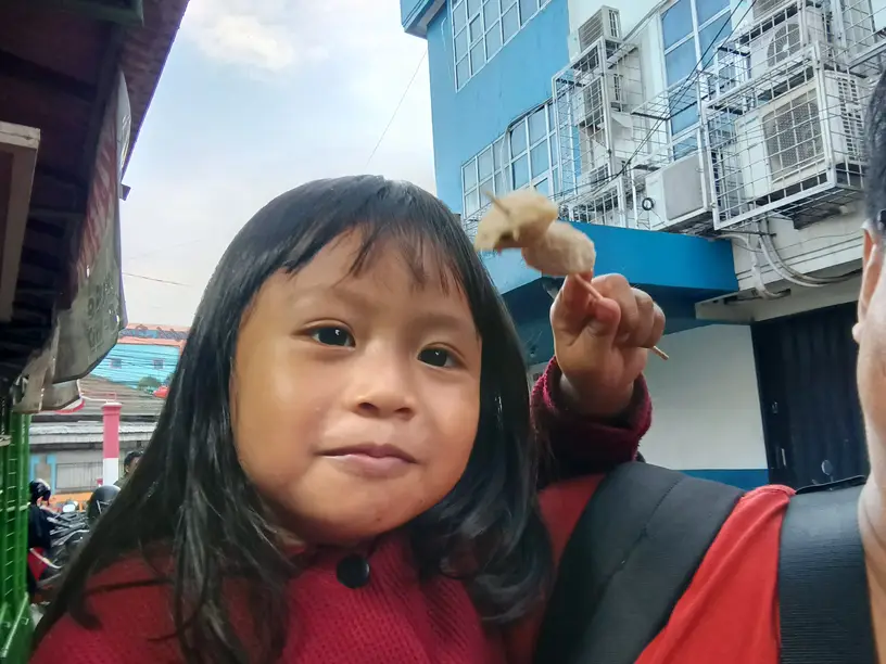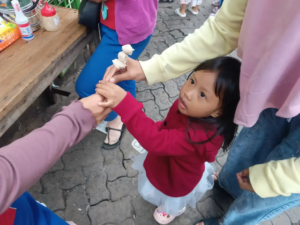 Dan gak cuma itu, act of service masnya juga patut saya acungi jempol sih. Setiap kali dia melihat ada anak kecil yang terselip dalam antrian, secara sigap dia langsung menawarkan satu tusuk pentol kecil secara cuma-cuma.