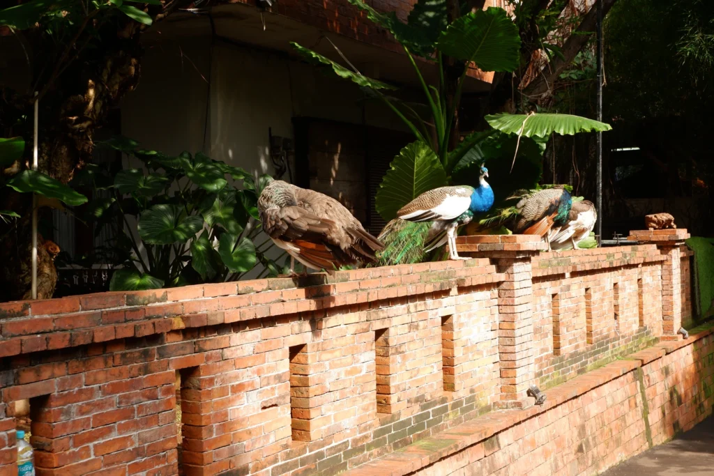 Setelah meninggalkan motor di Parkiran, kami langsung bergegas ke area dalam. Kedatangan kami langsung disambut oleh dua ekor Kerbau berwarna putih albino yang sedang makan rumput dengan lahapnya. Ada juga beberapa ekor merak yang sedang nangkring santai di atas pagar bata. Nampaknya sedang berjemur ria di pagi hari.