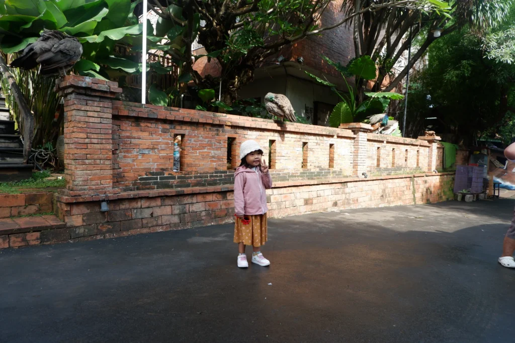 Suasana disini terasa damai dan tenang. Dengan banyak pepohonan hijau yang menyajikan keteduhan, berpadu dengan arsitektur unik selayaknya rumah tempo dulu. Sementara hewan-hewannya sendiri banyak yang dilepas-liarkan.