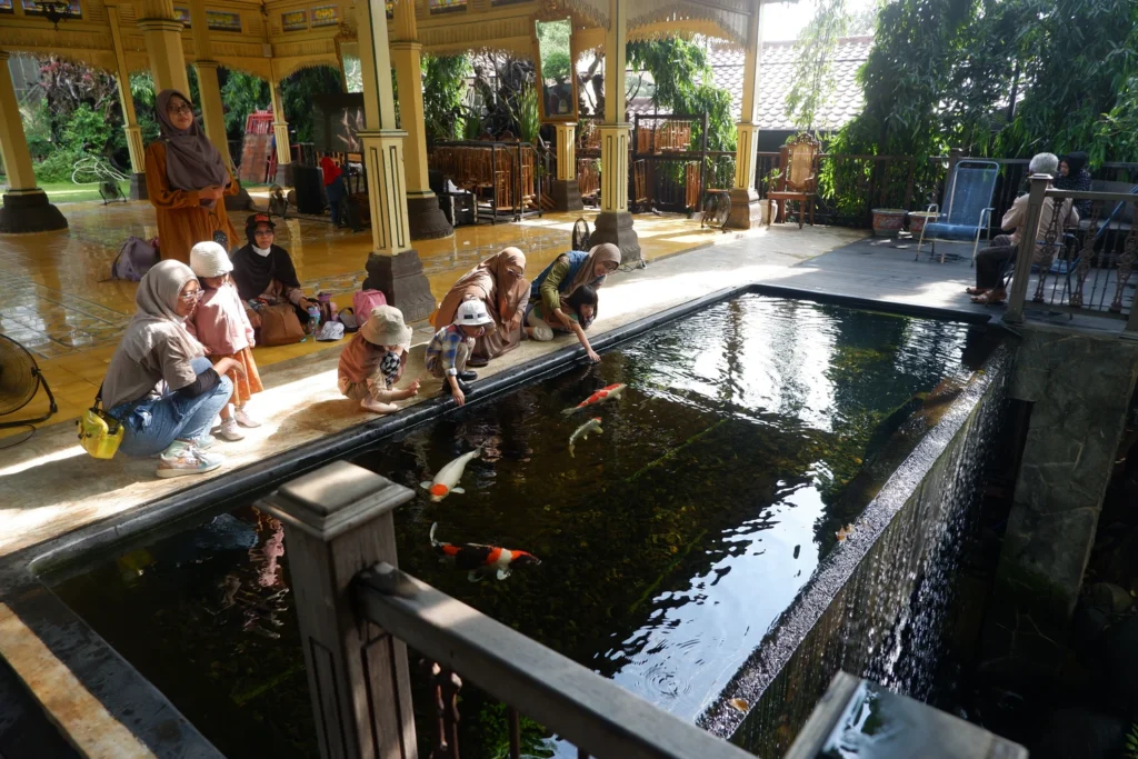 Samping pendopo ini, ada sebuah kolam dengan ikan koi yang berukuran besar. Makin terasa sekali vibes zen nya lho. Adem dan syahdu banget suasananya. Tinggal kurang musik shiatsu aja ini sih, hahahaha.