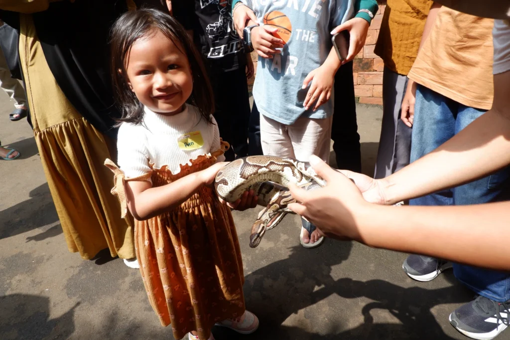 Putri & Thina keliatan Antusias banget sih. Walaupun memang agak syulit beradu gesrek sama rombongan emak-emak, tapi akhirnya bisa juga berfoto sama uler dan binturong, hehehe.
