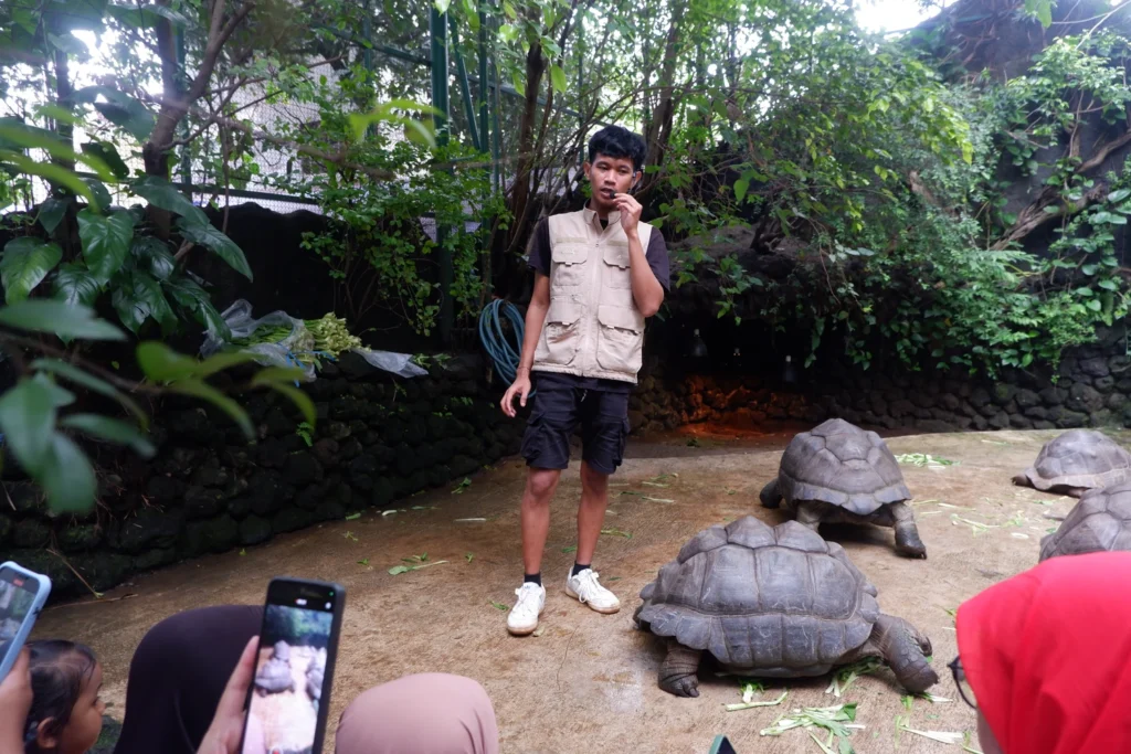 Para keeper membawa rombongan ini menuju satu sudut di ujung ruangan. Dan ternyataaaaa, ini tuh berisi kura-kura terbesar kedua sedunia. Ada yang tau namanya apa?