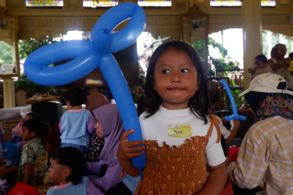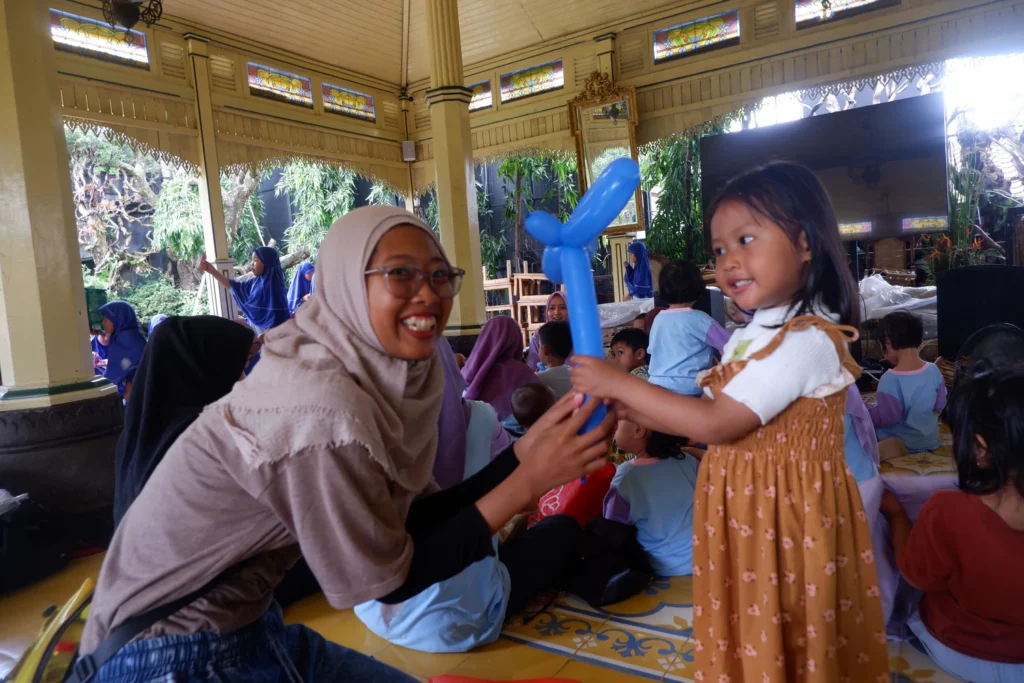 Oya, dari Shinning Kids Class, juga ada persembahan spesial menyambut Hari Ibu. Jadi anak-anak diajak untuk bikin bentuk bunga gitu dari sebuah balon panjang. Tapi yaaa… apa daya. Bukannya jadi bunga, balon yang saya bikin malah lebih mirip kayak tunas buah kelapa, hahahaha.