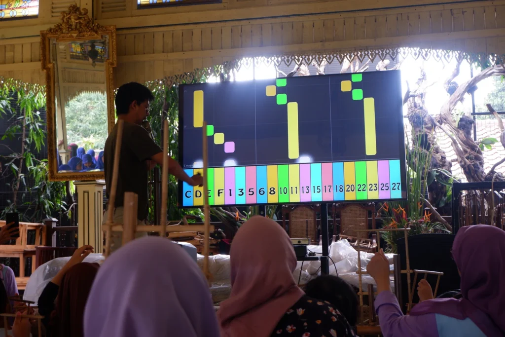 LCD TV kemudian dinyalakan, dan menampilkan grafik selayaknya di Game Guitar Hero. Nganu, lewat layar inilah nantinya seluruh rombongan akan mendapatkan patokan untuk mengiringi sebuah lagu. Dan karena tiap orang cuma fokus ke satu kode nada, jadinya akan terasa mudah sekali.