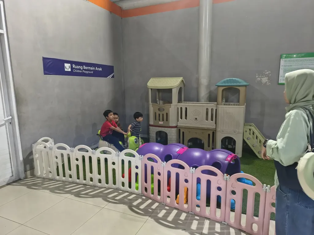 Ini fasilitas yang ngebantu banget buat para orang tua yang memiliki bocil toddler. Karena alih-alih memaksa anak untuk menanti di dereta deretan kursi, kini para orang tua bisa memaksimalkan playground ini agar anak-anak bisa menanti dengan lebih santai dan tenang. Manalah gratis pula, ya kan.