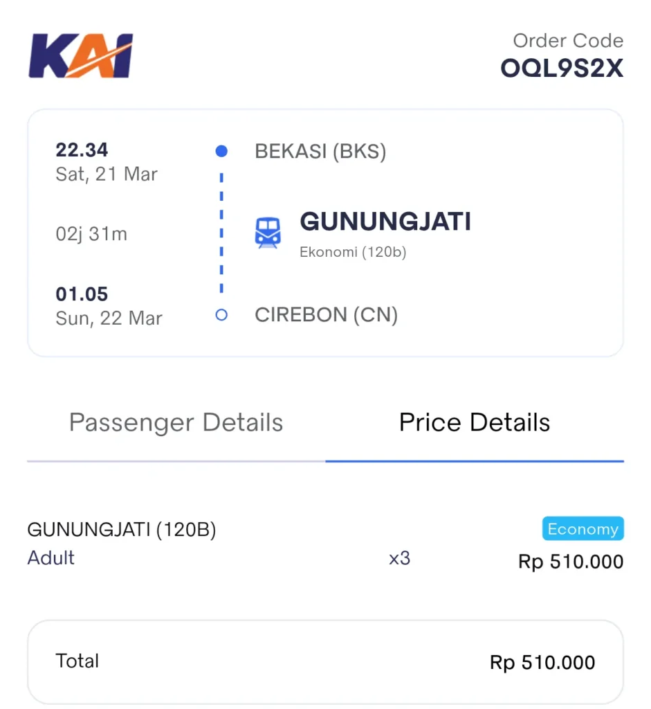 Lebih detilnya, saya dapet tiket di aplikasi KAI Access untuk KA Gunungjati, keberangkatan Stasiun Bekasi (BKS) menuju Stasiun Cirebon (CN).