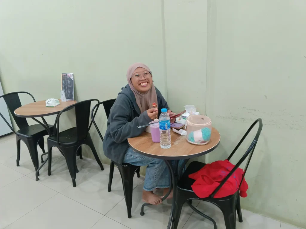 Thina memutuskan untuk membeli seporsi seblak, dan satu cup milkshake taro. Sementara saya… ndak beli apa-apa. Kebetulan pas mau berangkat sudah makan, jadi sampai sini sudah nggak lapar sama sekali.