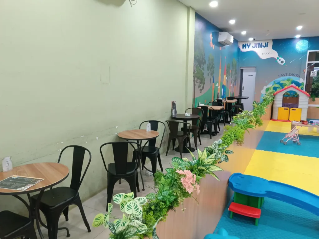 Ciamik yak My Jinji Playground & Cafe ini. Minimalis bagian kafenya, jadinya semisal orangtuanya lagi makan bisa sekalian melihat ke arah anaknya yang lagi berada di tempat bermain.