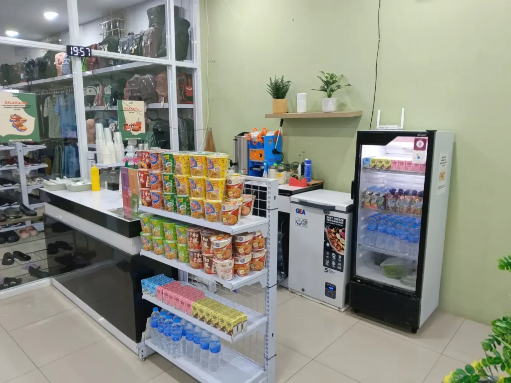 Yaah, walaupun menurut saya cafe-nya ini lebih mirip kantin gedung olahraga ketimbang cafe. Karena jangankan mesin kopi.. sekedar alat masak memasak yang proper pun nggak saya temukan disini. Cuma ada freezer, kulkas berisi minuman kemasan, serta deretan pop mie yang tersaji dalam rak besi yang rapi.