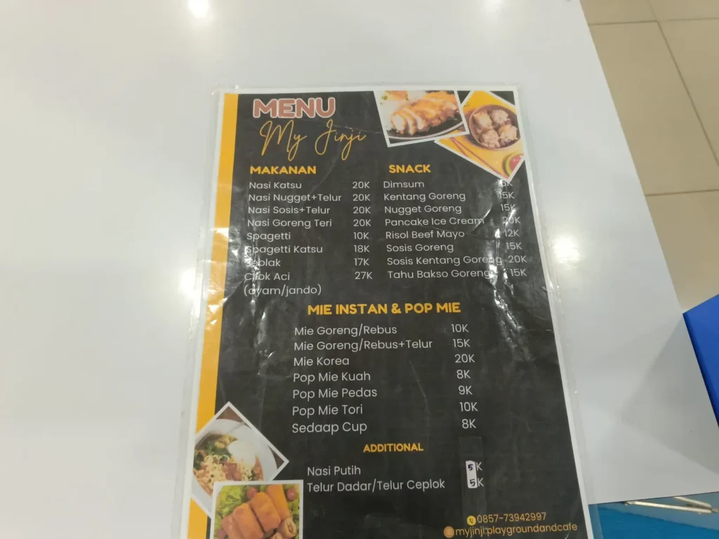 Murah banget ini tempatnya. 25 ribu buat tempat lengkap kaya gini dan sepuasnya sih cocok dijadiin langganan. Apalagi bisa ngemil sambil memantau anak. Harga makanan dan minumannya juga murah. Lumayan buat melipir sejenak kalau bosan.